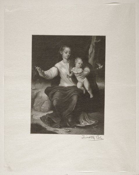 Curator: This is Timothy Cole's "Saint Joseph and Child," created in 1904. It’s a wood engraving, offering a compelling take on a classical subject. Editor: There's a delicate quality here, isn’t there? The soft greys lend a certain gravity to the scene. It's less grand, more intimate. You feel as though you’re witnessing a quiet moment between father and child. Curator: Precisely! Cole made a name for himself reproducing the Old Masters through wood engraving. His works circulated widely as magazine and book illustrations, making European art accessible to American audiences. He really democratized access to art in a way. Editor: It's fascinating to consider the impact of reproductive prints. So this image would have been something like a family snapshot of idealized piety in American homes? It does carry a very different connotation being outside its original mass-market format. It invites more questions than it answers here. Curator: Absolutely. In its day, this would have reinforced popular notions of family and devotion. Look at the original artwork and you may consider its status, artist, period… Look at an engraving, and you wonder about production, printing technologies, and marketing channels that are also part of the imagery ecosystem. Editor: So, is this image challenging assumptions, or re-confirming them through circulation? The ambiguity feels palpable. Curator: And maybe that is precisely where its enduring resonance lies. This piece showcases a father’s embrace and protection, a child's vulnerability, all rendered with Cole’s masterful technique. How was an artist replicating master painters but leaving an indelible signature of his own technical innovation and sensibility? Editor: This engraving offers so many layers. You initially think it is just Saint Joseph but actually, you're peering through the artist's interpretation. It makes me appreciate art not only for what it depicts, but for what it facilitates—dialogue and constant inquiry. Curator: I'm always so interested in looking at this kind of artwork. It helps me step back and look again with a more critical but appreciative lens.