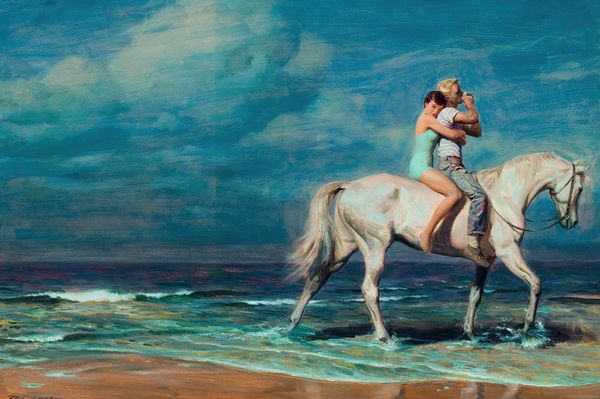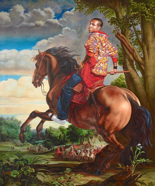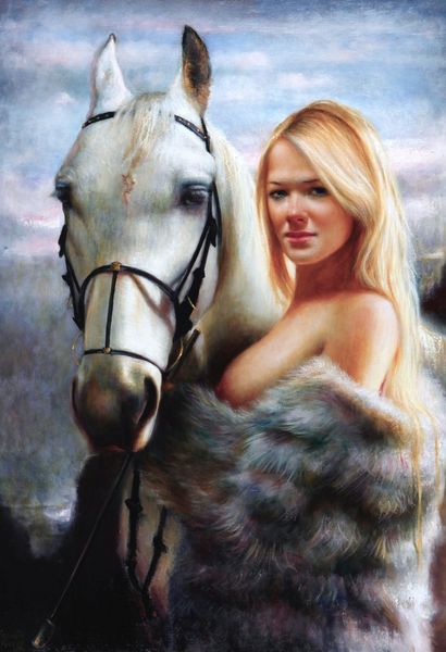 Jana Brike made this painting, titled 'The End of a Lonesome Road', sometime after being born in Latvia in 1980. Brike is part of a generation of Eastern European artists whose work navigates identity and self-discovery in a post-Soviet world. Here, a young girl sits astride a unicorn amidst a sun-dappled forest. The unicorn's body is covered in tattoo-like drawings that evoke the visual language of memory and experience. The choice to 'tattoo' the unicorn complicates our sense of purity. Simultaneously innocent and knowing, Brike's art often features girls on the cusp of womanhood. She says that the girls represent her own "exploration of the world, where the soul meets matter." In this dreamlike world, the artist uses the imagery of fairytales to explore themes of innocence, sexuality, and the search for self. In this world, girls are not merely symbols of purity but active agents in their own stories. This canvas captures a moment of transition from innocence to experience, in which the "lonesome road" ends not with despair, but with the magical possibility of a personal journey.