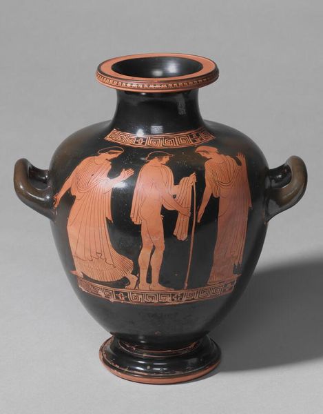 This belly-amphora, or storage jar, presents a striking contrast between the black ground and the reddish-brown figures, creating a visually arresting composition. The eye is immediately drawn to the frieze depicting a scene with figures and a centaur. The anonymous artist’s technique focuses on clearly defined forms and patterns, employing the contrasting colors to delineate shapes and narratives. Notice how the figures are arranged in a structured, almost symmetrical manner around the vessel, suggesting a deliberate attempt to balance form and content. The repetition of linear elements, such as the decorative border at the top, reinforces the amphora’s structural integrity while adding a layer of visual complexity. This interplay between form and decoration invites us to consider how the visual elements function as signs. It not only enhances the vessel’s aesthetic appeal but also contributes to its symbolic function within the cultural context of its time. The formal qualities of the amphora underscore its role as a medium through which stories and values are communicated.