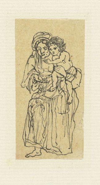 Curator: Looking at "Girl at Her Toilet," a drawing created around 1810, housed right here at the Minneapolis Institute of Art, what catches your eye first? Editor: There’s an almost melancholic serenity to it, a quiet intimacy. She seems lost in thought, her posture suggesting vulnerability and introspection. The delicate line work gives it an ephemeral quality, as if the moment could vanish any second. Curator: Exactly. This piece, rendered in ink on paper with touches of watercolor and colored pencil, depicts a woman in what appears to be a private moment of grooming. It’s a miniature, emphasizing that sense of intimacy, almost like we are peeking in on something forbidden. Editor: Forbidden, or perhaps simply unseen? What does it tell us about the position of women at that time, this willingness, even eagerness, to capture and display them in this context? Curator: That's a perceptive question. In a society still structured along rigid lines, the female body became a crucial site for asserting social status, beauty ideals, and patriarchal control. But on another reading, aren't there nuances here too? Perhaps a reclamation of personal space? A celebration of routine, in this ritual of self-care? Editor: Perhaps. I’m stuck on her gaze, it does not meet ours, doesn't seek validation, creating an air of mystery around her and what this small painting has been trying to immortalize. I imagine a time where owning one of these was seen as something very private indeed, a peek into the intimate world of someone who couldn't really escape from what society expected of them. Curator: Absolutely. This drawing opens a small door, offering a rare glimpse beyond those norms. By looking closer, we uncover layers that invite empathy and prompt crucial historical conversations. Editor: And in the end, perhaps, it's less about seeing *her* than about catching a reflection of ourselves in her story. It asks: What stories are we compelled to preserve, and who gets to tell them?