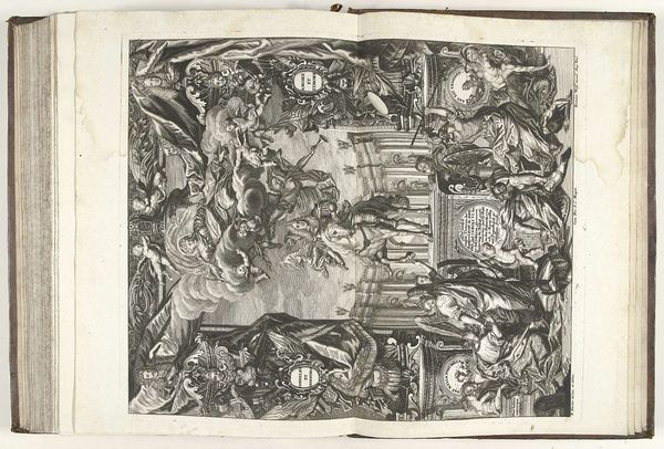 Editor: This is "Blazoen van Het Mariacransken," an engraving from 1561 or 1562, held at the Rijksmuseum. The scene feels incredibly dense, almost dreamlike in its juxtaposition of images, with figures that seem both classical and demonic. What do you see in this piece? Curator: I see a complex tapestry of symbols that reflect the anxieties and cultural memory of the Northern Renaissance. Note the division into earthly and divine realms; it's a potent visual metaphor. The scene to the left presents figures in earthly garb alongside horned, almost theatrical demons, possibly signifying moral corruption within the worldly sphere. The other side evokes a maritime mythology, perhaps Neptune, with figures above in celestial grace. Consider this dichotomy of visual codes. What effect do you think it has on the viewer? Editor: I think the strong contrast does create tension. It's like two different worlds colliding or commenting on each other. The heavenly grace makes the earthly corruption all the more striking. Is there any specific religious or cultural context that may explain its symbolism? Curator: Absolutely. The image appears to be a complex morality play, a visual sermon intended to be 'read' by an audience steeped in religious imagery. Note the posture and expression of the foregrounded man among demons on the left – he might signify leadership astray. The Mariacransken was possibly a Marian society, and this image, full of allegorical representations, may refer to dangers, and triumphs, faced by it in a time of growing societal turmoil. The inclusion of pagan symbology alongside Christian ones also might show an urge to find order across distinct traditions. Editor: That’s really interesting. The layered symbolism makes it much more than just a pretty picture; it becomes a real historical and cultural artifact. I guess seeing through an iconographical lens is a key skill. Curator: Indeed. Understanding those layered meanings unlocks not just the image but the very soul of the culture that created it. Symbols endure, reshape, and carry cultural memory forward, it's our task to see how these visual signs take us to new insights about human psyche, social history, or artistic creations across eras.