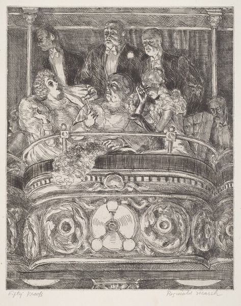 Editor: This is Adolph Menzel's "The Monument of Marshall Moritz von Sachsen in the Thomas Church in Strassburg." It's a detailed drawing, quite small, and I'm immediately struck by the dramatic use of light and shadow. What do you see in this piece? Curator: The linear precision and tonal gradations define form and space. Observe how Menzel uses hatching and cross-hatching to model the figures and drapery. Do you notice how the composition is structured around a central pyramidal form? Editor: Yes, I see that now! The Marshall is at the apex, and the figures cascade down the sides. So, would you say the formal arrangement enhances the monumentality of the subject, even in this small format? Curator: Precisely. The artist’s meticulous technique and calculated arrangement elevate the subject beyond mere representation. It’s a powerful exploration of form and composition. Editor: It’s amazing how much impact it has despite its size. Thanks, I've learned a lot! Curator: Indeed, a rewarding exercise in visual analysis.