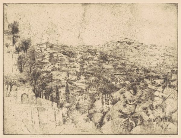 Curator: Moishe Smith's "Liguria," a print from 1963, presents a stunning, almost dreamlike landscape. What are your initial impressions? Editor: Whoa. It's like looking at a charcoal drawing… a hyper-detailed nightmare forest, but inviting. It feels almost claustrophobic. I feel surrounded. The landscape rises right up to the viewer. Does that make sense? Curator: Absolutely. We see a mountainous region, possibly depicting the Italian region of Liguria, hence the title. The interesting thing to note here is Smith’s engagement with geometric forms, which challenges conventional ideas around landscape art as inherently ‘natural’ or ‘picturesque.’ He seems to question the idea of "pure nature," revealing how our ways of perceiving and depicting are mediated by our thinking. Editor: It is strange, though, how much detail is crammed into one frame. Check out those houses tucked among the trees. I see life here… but I mostly just see all the textures. The soft leaves contrast sharply with geometric shapes of the constructed environment, right? And it’s all gray… So much gray… What does it mean? Is Smith expressing something deeper, you know? Like, the anxiety of place? Curator: I believe he prompts viewers to reconsider landscape art beyond mere scenic appreciation, and how our environment has come to exist. The high contrast evokes social anxieties and speaks about ownership of land, about whose view we are privileged to see in this piece, and what stories are not present, whose labors made such an idyllic setting. Editor: That's a super intense reading. But maybe he just liked the play of light and shadow? Or how trees are different up close? Maybe he just liked those Italian villas tucked between the foliage? What I like about it is that I’m also allowed to be both drawn in and pushed away. Like real life, actually. Curator: That complexity makes the piece all the more interesting for engaging with its historical and social layers. This is how art should function! Editor: For me, it just feels moody. And that mood is all about questions with no real answers… and maybe a touch of genius.