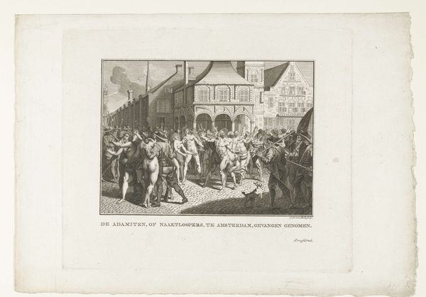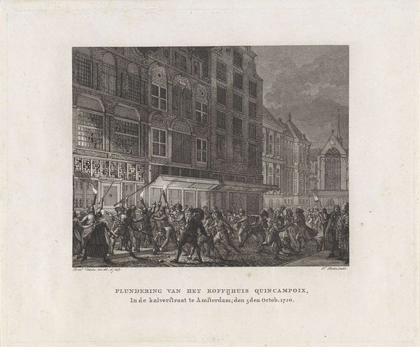 Reinier Vinkeles created this engraving around 1786, depicting a tumultuous scene in Dordrecht. Engraving is an intaglio process, where the artist meticulously cuts lines into a metal plate, applies ink, and transfers the image to paper under high pressure. Look closely and you’ll notice the incredible detail achieved through this demanding method. Vinkeles would have used specialized tools to carve the design, demanding immense skill and control. The stark contrast between the fine lines and the white paper creates a sense of drama, highlighting the tension of the moment. Engravings like this one were important visual records during a time before photography. They were a form of mass media, circulating news and political commentary to a wide audience. The labor involved in creating such a detailed image speaks to the value placed on disseminating information and shaping public opinion during this period of political unrest. Consider the social context, the careful work and the materials. This print encourages us to think about how art-making can be both a craft and a powerful tool for social change.