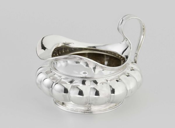 Editor: Standing before us is a stunning jug, crafted between 1841 and 1842, residing here at the Minneapolis Institute of Art. They call it "Jug in the form of an Askos," blending silver, metal, and glass into an enchanting sculpture. What I notice most is how ethereal it feels – almost like holding a cloud, yet grounded by the solid silver work. How would you interpret this work? Curator: Oh, "ethereal," what a perfect word! It’s funny, I always see a touch of cheeky extravagance in it. This jug, you see, isn't just a functional object; it's a playful statement. The silversmith, probably chuckling to himself, is referencing the ancient Greek "askos," a funny little vessel that looks like a flattened wineskin. Editor: So, it’s kind of a historical wink? Curator: Precisely! He’s saying, "I know my classics, but I'm also going to bedazzle it with all this romantic-era fuss." I mean, look at the little dog perched jauntily on top and the flowing handle. What's stopping the artist of adding a bit of playfulness with the references from Ancient Greece? Editor: It definitely takes the pressure off – like it doesn’t take itself too seriously. So, what do you take away from that as a viewer? Curator: It's permission to enjoy beauty without stuffiness! I love how it bridges centuries with a grin, urging us to find joy in unexpected places. It is the details within its structure that highlight and showcase beauty within art and life! Editor: That makes me appreciate it so much more. It's like it’s inviting you to smile along with history. Thanks for sharing your perspective, I won't see it the same way again! Curator: Absolutely, art’s just a conversation, isn't it? And this quirky Askos has quite the charming accent!