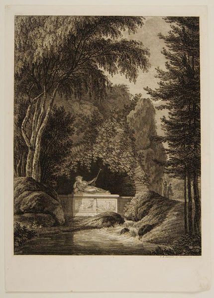 Curator: The first impression I get from this print is one of quiet retreat, a kind of rustic idyll. Editor: This is "A Moat of the Château of Ermenonville," a print by Alfred Louis Sargent. It presents a scene that blends domesticity with the historical architecture. Curator: The figures draw my eye – a woman and child descend into the moat, accompanied by their dog. It feels like a symbolic journey, a descent into the depths of memory or the unconscious. Editor: Ermenonville itself became a cultural symbol in the late 18th century, associated with Jean-Jacques Rousseau and the picturesque movement. This image likely carries those associations. Curator: Note how the sharp lines used to depict the natural growth around the buildings contrasts with the smoother rendering of the figures. Does it suggest a tension between civilization and nature? Editor: Perhaps. The image invites us to consider how we negotiate the spaces of history and nature, and how those spaces are imbued with cultural meaning. Curator: Yes, and in seeing this image, we’re also participating in a conversation that stretches back centuries about the meaning of landscape and place. Editor: Indeed. The visual language of the picturesque continues to resonate today.