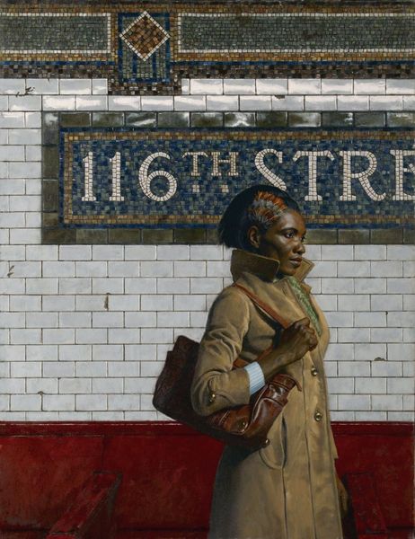 Curator: This oil painting is called "Renee – Wall St." by Daniel Greene. It depicts a young woman standing in what appears to be a subway station. Editor: Immediately, I’m struck by the juxtaposition. The cool, almost impersonal architecture—those glossy blue tiles and stark sign—contrasts sharply with the warmth and evident humanity of the subject. It’s a rather melancholic arrangement, isn't it? Curator: It does have a poignant quality. The choice of location—Wall Street, a place synonymous with high finance and ambition—places the sitter within a very specific context. What might a portrait set in this location say about the relationship between individual identity and economic forces? Editor: The color palette is carefully constructed. Note how the cold blues and grays of the subway tiles amplify the subtle pinks and golds in Renee’s skin and hair, lending a remarkable glow. The textures, from the shiny tiles to the soft hair, add dimension, a real painterly quality. Curator: Greene was known for his portraits of corporate leaders, which makes this painting feel a bit subversive. Here, he focuses on an ordinary woman, perhaps waiting for a train, surrounded by the symbols of financial power. Is he humanizing Wall Street by representing the everyday people who traverse it, or is he critiquing its inaccessibility? Editor: Consider also her pose—arms crossed, a slightly withdrawn gaze. It introduces a sense of isolation. Yet there's also strength. The composition positions her powerfully against the receding architecture, ensuring she holds the viewer's attention. It isn't a flattering or overtly expressive pose, yet her presence is very clear. Curator: Perhaps Greene is commenting on the transient nature of modern urban life and a woman holding her own in the finance environment. The subway becomes a kind of liminal space where individual stories intersect. Editor: Precisely. Looking closer reveals so many carefully laid colors; a lot of effort and care has been put into this "everyday" subject. An understated painting but it holds real technical prowess, I think. Curator: Absolutely, I feel it provides much needed social commentary within an accessible style. Editor: Agreed.