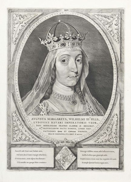 This engraving, made by Cornelis Visscher around the mid-17th century, presents a formal portrait of Maria, Duchess of Burgundy, encased within an oval frame. The composition employs a stark contrast between the dark, solid areas of her headdress and the delicate, detailed lines used to render her face and attire. Visscher masterfully uses line work to suggest depth and texture, particularly noticeable in the intricate patterns of the frame and the subtle shading of Maria's features. The oval format, typical of portraiture of the era, serves to isolate and elevate the subject, creating a sense of formality and timelessness. The structural arrangement—the figure centered, framed, and balanced—speaks to the conventions of representation and power. Here, the artist navigates and reinforces social hierarchies through visual language. The visual elements do more than depict; they construct a statement about status and historical continuity.