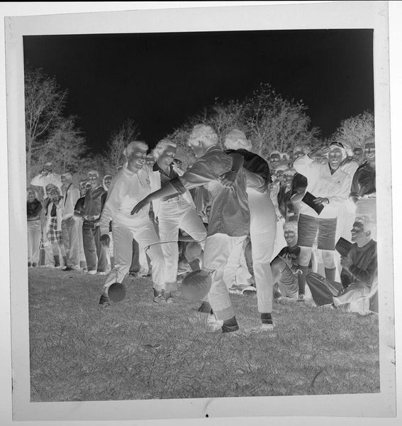 Curator: This is an untitled piece by Jack Gould, currently held in the Harvard Art Museums' collection. Editor: Wow, it's like a negative from some forgotten summer. A crowd gathers, a figure falls... it's got this charged, almost ritualistic vibe. Curator: Indeed. The image's symbolic weight hints at a rite of passage, perhaps, or some kind of social drama playing out under the watchful gaze of the trees. Editor: I feel like the inverted tones heighten the sense of mystery, pushing it further into the realm of memory and myth. It makes me think about how we construct narratives around these fleeting moments. Curator: Precisely, the photographic reversal enhances its timeless quality. We’re left to ponder the enduring symbols of youth, community, and the unspoken rules that bind them. Editor: I agree. It's a haunting snapshot that really sticks with you.