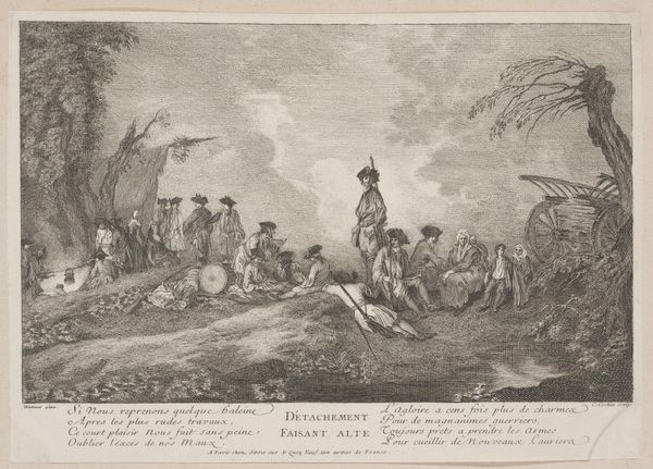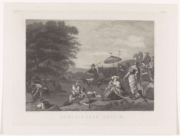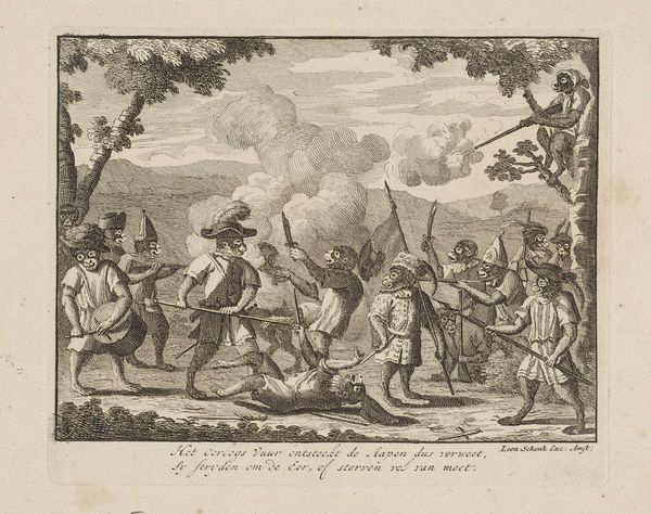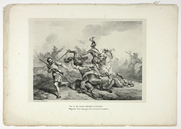 Editor: Here we have an engraving titled "Prins van Oranje raakt gewond tijdens de slag bij Waterloo, 1815", created in 1815. The print depicts the Prince of Orange injured during the Battle of Waterloo. The scale is intricate and miniature, almost like a world captured in a snow globe of war. I find myself drawn into the stark contrasts between light and shadow. What do you see as you examine the visual structure of this print? Curator: The formal elements speak volumes. Note the artist's deft manipulation of line to create depth and texture. See how the clustered, angular lines build up tension and chaos on the battlefield, whilst the smoother, flowing lines describe the clouds, establishing a clear contrast. Editor: I see it, the lines really do guide my eye across the landscape. Is there significance in the placement of the Prince in relation to the other figures? Curator: Indeed. His position, slightly elevated, draws the eye but is balanced precariously between the fray and the somewhat calmer right side. This suggests a tension between his leadership role and his vulnerability in the midst of battle. Further consider the materiality, the engraving marks are tools in this composition, dark versus light; density dictates hierarchy, chaos or calmness; the figures exist only in this context of contrasting elements. Editor: So, it's less about what's depicted, and more about *how* it’s depicted that gives it meaning? Curator: Precisely. The historical context provides narrative, however, the arrangement and formal rendering is key to unlocking this print's message. We must consider this piece as a series of carefully constructed signs. Editor: This close reading gives me a totally different understanding, framing this piece beyond its historical narrative. Thank you! Curator: My pleasure. Understanding art begins with truly seeing it.
