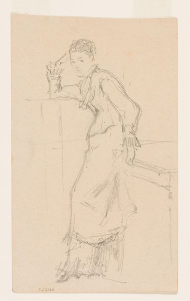 Curator: Here we have "Lille pige der st\u00e5r p\u00e5 en stol og kigger ud af et vindue," or "Little Girl Standing on a Chair Looking Out of a Window" by Ludvig Find. It's a pencil drawing from the period 1869 to 1945, currently held at the SMK, the National Gallery of Denmark. What strikes you most about it? Editor: There's a quiet melancholy to it. The bare, almost hesitant pencil lines create a sense of fragility and isolation, even innocence. The girl's facelessness, the focus on her form turned away… it’s very poignant. Curator: Indeed. Find’s choice of subject matter places the artwork within a broader tradition of genre painting popular at the time, particularly representations of domestic life and childhood. However, he avoids sentimentality, focusing instead on a candid moment of contemplation. Editor: The composition is fascinating, isn't it? The window frames the girl, but also acts as a barrier. The repeated verticals of the window and chair create a subtle, almost imprisoning feeling, countered only by the angle of her legs suggesting movement. It leads my eye towards the exterior the little girl seems to focus on. Curator: Considering that, there may also be social context. Her looking out of the window evokes larger discussions surrounding social observation, especially in light of women and children's societal roles. It invites questions about spectatorship and social boundaries during this era. What could she possibly be observing? Is her observation also an anticipation? Editor: I think the raw quality, of the lines—almost like a preliminary sketch—actually amplifies that feeling. It feels immediate, less posed, as if we've stumbled upon this very private moment. Even the limited shading draws the viewer's focus exactly to her dress and posture as if she is preparing to be revealed to the viewer looking outside as much as the art viewer looking in. Curator: Perhaps this reflects shifting artistic values toward naturalism and capturing the immediacy of experience. This piece speaks to broader intellectual and cultural trends shaping perceptions of childhood in the late 19th and early 20th centuries. Editor: Absolutely. I think it makes a lot of interesting artistic statements. Curator: Precisely, there's much to unpack here in this evocative sketch, considering the gaze, space, and even class in its own humble ways. Editor: Agreed, its deliberate artistic choices open such subtle lines of thought, despite how little is materially offered.