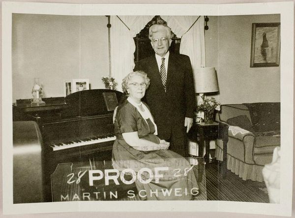 Editor: Here we have an untitled portrait by Martin Schweig, showing a couple. The high contrast creates a formal, almost austere mood. What strikes you about the visual composition? Curator: Indeed, the stark contrast and shallow depth of field direct our gaze to the subjects' faces. Notice how the interplay of light and shadow models their features, imbuing them with a quiet dignity. The meticulous arrangement of forms suggests a conscious effort to construct a particular image. Editor: It's interesting how such simple elements create such a specific feeling. Curator: Precisely. It is in the manipulation of these basic pictorial elements that the work achieves its aesthetic effect.