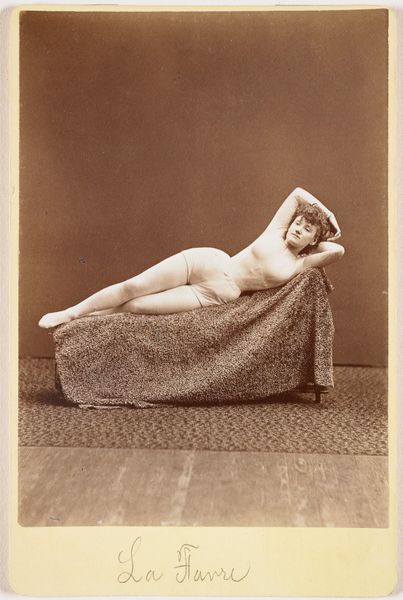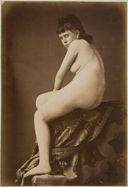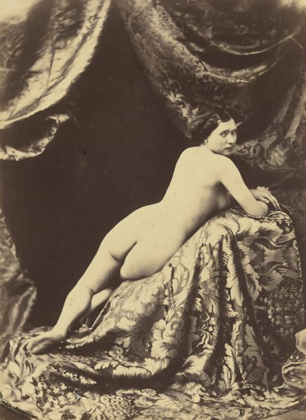 Curator: Allow me to introduce Oscar Gustav Rejlander's "Ariadne," created in 1857. It's an albumen print currently housed here at the Metropolitan Museum of Art. Editor: My first thought is loneliness. There's a palpable vulnerability in her pose, turning away, as if from a world she no longer wants to face. And that soft, almost hazy quality... like a memory fading at the edges. Curator: It's fascinating how Rejlander blended the emerging art of photography with classical themes. The title "Ariadne" references the mythological figure abandoned by Theseus, which adds another layer of interpretation. Think about the socio-historical implications of such representation back in 1857, especially concerning the construction of the female body! The darkroom process was surely laborious. Editor: Absolutely, the darkroom labor adds to my reading of isolation. Each print, crafted meticulously, carrying the weight of the sitter's supposed shame. It also speaks to the limited consumption and production possibilities of art back then— the materiality, so scarce and revered. Curator: Speaking of materiality, consider the use of albumen, derived from egg whites, to create the photographic emulsion. Isn't it striking that such delicate imagery emerges from a rather mundane material? I love that connection of body and home. I mean, the curve of the neck is simply gorgeous. Editor: That leads me to wonder: Who was this woman, really? Rejlander has clothed her with symbolism, but, what about her? Do you think this process and the reference to egg whites renders the female model's lived labor—the time spent posing—somehow obsolete? What about its economy, even back then? Curator: That’s a compelling question. There is such a deep sense of intimacy, perhaps a staged intimacy. You almost forget the clinical photographic process as if one were sneaking into a boudoir! It speaks volumes about Rejlander's ability to manipulate the viewer's gaze. That fabric could signify decadence and wealth! Editor: Exactly! Now I’m even more convinced of the constructed drama here. The whole work is caught between supposed ‘natural’ depiction and material and symbolic construction, a contradiction for any reading. Curator: Well, pondering those tensions certainly gives the image added resonance today. Thank you for shedding light on "Ariadne"! Editor: Thank you; my pleasure.