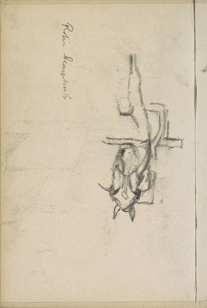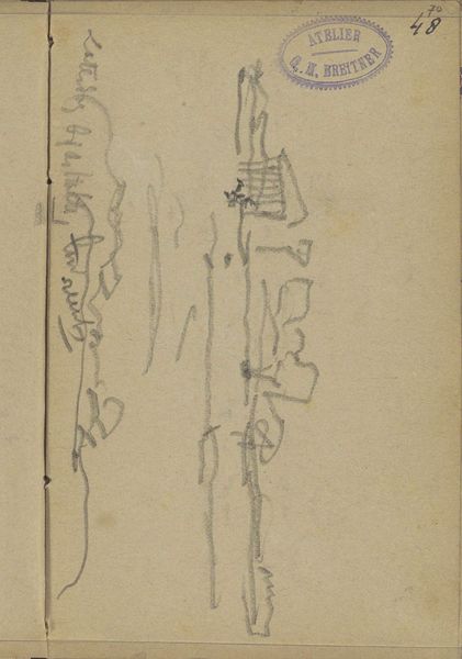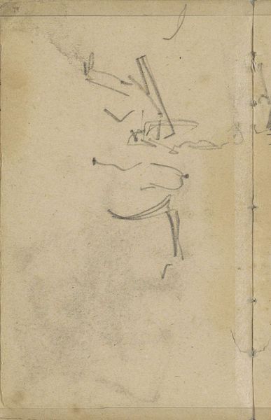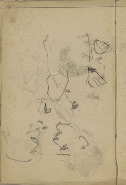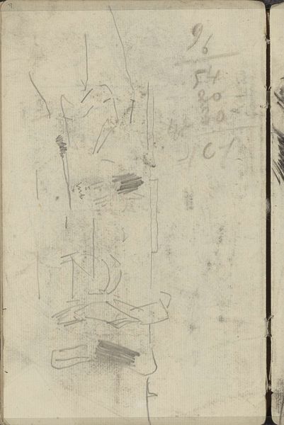 Curator: My eye is immediately drawn to the gestural quality, it's intriguing. Editor: Absolutely, it has a raw, unfiltered quality. Let’s delve a bit into George Hendrik Breitner’s Figuren die ergens aan trekken, or “Figures Pulling Something,” created circa 1881-1883. This sketch, rendered with pencil and watercolor, resides within the Rijksmuseum collection. Curator: The aged paper gives it a kind of ghostliness; forms emerge from this tonal ground as if recalled from memory, what sort of story does it tell you? Editor: Breitner's art frequently captures the realities of working-class life in Amsterdam. Looking at the composition here I see suggestions of labor and exertion, forms strain and lean as though under duress, could this refer to specific socio-economic circumstances prevalent in the late 19th century? Curator: It very well could be the representation of the human body contorted to function in conjunction with some archaic machinery, giving us insight into its operations and utility. And what might these obscured characters and the aged, worn page upon which they're scrawled mean in a contemporary setting? Editor: Its lack of finish contributes to the impact for me; its openness could function as a reflection on social anxieties over modernization that remain salient today. Curator: What a fantastic insight. The sparseness really lets viewers project their own experiences of labor. As viewers, how are we implicated? Editor: It challenges us, I think, to consider our own participation in systems that might be exerting a similar pressure, if more indirectly. The symbolism invites a broader reflection, doesn’t it, on the enduring nature of labor struggles and how they shape individual lives. Curator: Agreed, recognizing that art is so often produced and consumed through networks of social and political power is imperative. It feels very honest to leave this artwork unfinished for a viewer to consider. Editor: Precisely, and in its incompleteness, it fosters a potent reminder of our collective capacity to shape—or perhaps reshape—those very narratives.