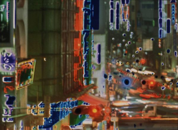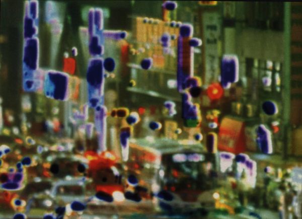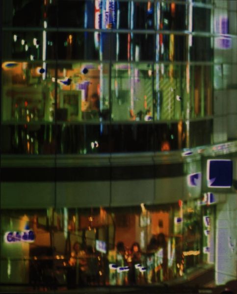 Invisible City 2001 is a series of six digital prints based on an image from Yass's work of the same title created in 1998. This earlier work comprises four photographic transparencies displayed in light boxes and four short videos. The photographs were taken in Tokyo and depict street scenes taken from the same viewpoint looking 'north', 'north-west', 'north north-west' and 'south'. The digital prints are all component parts of the image subtitled 'north-west' in the original work. Their own subtitles, consisting of the words 'north-west' together with a letter and number reference, such as D6 or D4, suggest map co-ordinates. However these 'co-ordinates' do not follow a logical structure related to the grid they apparently refer to and seem random in their selection and allocation. The digital prints are similar in size to the transparency from which they are derived. Thus scaled-up, these segments of the original represent a greater degree of abstraction. Some, such as Northwest F6, have virtually no recognisable elements and have become compositions in vivid colour. Others, for example Northwest F3, clearly depict a section of a tall modern building illuminated romantically in blue and pink evening light. Light and its manipulated effects are important themes in Yass's work. At an early point in her career she discovered the possibility of reversing the positive and negative aspects of photographic film through an error. She has subsequently experimented and perfected a technique which has become her signature. Each image is produced by taking two photographs, several seconds apart, and then superimposing them. One is positive, the other negative, resulting in the light or white areas of the positive being filled in by the colour produced by the negative. Yass usually uses an intense blue, similar to the 'Chartres blue' of medieval stained glass windows, heightening the atmospheric and sometimes even transcendental effects of her image. In Invisible City the negative image is slightly smaller than the positive image, resulting in white halos around the 'negative' blue areas. The short time gap between photographs and the movement of the traffic in the busy street have contributed to the blur around patches of neon light. The buildings themselves, behind the luminous neons, provide ghostly support structures for the artist's study of city lights. Yass derived the title Invisible City from Italo Calvino's (1923-85) book of the same name (published 1972). The book is a sequences of essays describing fantastical imaginary cities fictionally recounted by Marco Polo (1254-1324) to Kublai Kahn (1215-94). Calvino's preface describes the idealising allure of the imaginary, unknown foreign city which is inevitably destroyed by the corrupting reality of conquest and attendant knowledge. Yass's images coupled with Calvino's title evoke aspects of the city which are present but which go unnoticed. Through the virtuosity of her technical intervention, she has transformed a constantly moving, anonymous and physically alienating modern environment into a space for fantasy, provided by colour and light. The portfolio Invisible City 2001 was printed and proofed at Chromograph in Woverhampton, England and published by Alan Cristea Gallery, London in an edition of forty plus ten artist's proofs. This is number twenty-nine in the edition. The images may be exhibited in any order. Further reading:Catherine Yass: Invisible City, exhibition brochure, Alan Cristea Gallery, London 2001, reproduced (colour) [pp.2-4 and 6-8]Parveen Adams, Greg Hilty, Catherine Yass: Works 1994-2000, London 2000, pp.5-6, 57 and 101 Elizabeth ManchesterMarch 2002