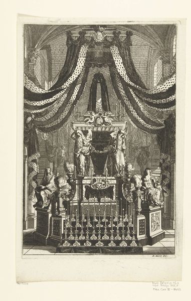 Editor: This print, "Mausoleum voor een koningin of prinses," is from before 1800 and its maker is anonymous. It’s quite striking, full of figures and symbols, but it definitely has a somber feel to it. How do you interpret the imagery? Curator: It is certainly laden with symbolism. Notice how the draped fabric mimics a proscenium arch, immediately setting a theatrical tone. But it's not simply theater; it is, as the title suggests, a constructed space of remembrance. Do you see the skulls flanking the bottom corners? They act as *memento mori*, constant reminders of mortality's presence. Editor: Yes, they're hard to miss! And the clocks just above, are they alluding to time slipping away? Curator: Precisely. Each element contributes to this complex allegory. Clocks symbolize the fleeting nature of time. Consider also the idealized figures surrounding what seems to be a portrait of the deceased. Who do you think they might be? Editor: They appear to be virtues or perhaps mourners, eternally guarding the memory of the queen or princess. Curator: That's a very astute observation. Baroque art often employs personification to give abstract ideas concrete form. It is intriguing to consider the cultural memory encoded within this print, and what it tells us about how power and loss were commemorated. What is your impression? Editor: It's powerful how all these elements combine to create such a poignant and multi-layered statement about grief, memory, and legacy. I hadn't initially grasped all the symbolic connections. Curator: Visual symbols help us navigate emotions. Understanding that allows us to better decode not just the past but how we process grief in the present, as well.