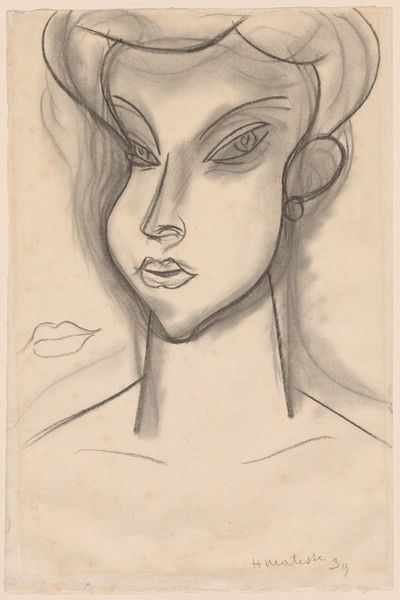 Editor: We're looking at Paul Gauguin's "Tête d’une Femme Tahitienne," made around 1895-1903, using pencil and charcoal. There's a raw, almost haunting quality to this portrait. What's your read on it? Curator: Raw is a brilliant word. It feels like he’s captured something deeply personal, wouldn't you agree? Look at the heavy lines, the shading around the jaw and neck – it’s almost as if he's wrestling with the image. It goes beyond mere representation, venturing into the emotional territory. And the paper itself…doesn't it remind you of old parchment, holding secrets whispered across time? Editor: Absolutely! It's like the drawing *itself* is aging, gaining a history. How do you think his time in Tahiti influenced this stark style? Curator: Ah, Tahiti…for Gauguin, it was both escape and inspiration, a land promising authenticity, even if he was chasing a myth. I suspect the relative lack of traditional art supplies pushed him to embrace the immediacy of charcoal and pencil. The cross hatching adds such drama to her face. Also the contrast to the blank "gaze", she has no eyes...it could almost be a mask. What kind of statement do you think that is making? Editor: A mask…an absence, definitely powerful. Maybe a comment on identity, both hers and his, as an outsider looking in? Curator: Exactly! The more he tried to capture the ‘true’ Tahiti, the more his own interpretation shaped the image. So we're not just seeing her, but Gauguin's experience, his longing. Isn’t it fascinating how a simple sketch can hold so much complexity? Editor: Definitely! I'll never look at Gauguin's Tahitian portraits the same way again. Curator: Wonderful! That’s the magic of art, isn’t it? Shifting perspectives, challenging our assumptions and showing a glimpse into the human heart.