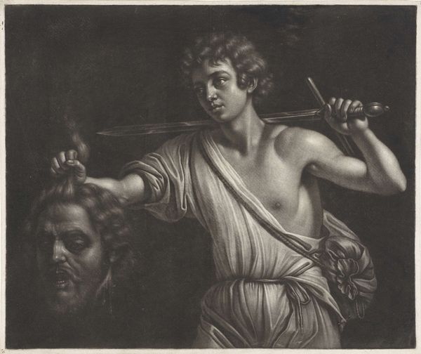 Curator: Looking at this painting, I’m struck by the darkness – it's intense and theatrical! Editor: Indeed. We’re observing Caravaggio’s “David with the Head of Goliath,” executed around 1600-1601. It's a dramatic piece, painted in oil, capturing a key biblical scene. Curator: The tenebrism is so strong here. See how the light just catches David's youthful face and contrasts so starkly with the inky background and the grim severed head? It’s almost cinematic, highlighting the emotional weight. Editor: Absolutely. But it’s more than just drama, isn’t it? Consider the socio-political implications of such a graphic depiction of victory and defeat during that era. The patronage and reception of such an image… Who was supposed to view it and what meaning did it serve in the larger culture? Curator: Those stark contrasts create incredible volume and texture; look closely, and you can feel the tension of the muscles in David's arm as he holds the head, even feel the weight. And Goliath’s head! The grotesque detail, the open mouth… It’s incredibly visceral. Editor: It is, but beyond the aesthetic response, what’s so compelling here is the power dynamic being represented. The vulnerable made victorious. David wasn’t some established hero; he was an underdog, symbolizing a victory for the common people. The Catholic Church was trying to consolidate power during that period and artists were often at work translating its messages for the masses. Curator: Yes, it powerfully reinforces narrative, absolutely! You feel for David despite his ghastly task. I can really see why Baroque art gets that descriptor of dynamic and full of tension now, thank you! Editor: A pleasure. Thinking about "David with the Head of Goliath," focusing on how form and context enrich our understanding of this seminal work reveals just how much history one painting contains.