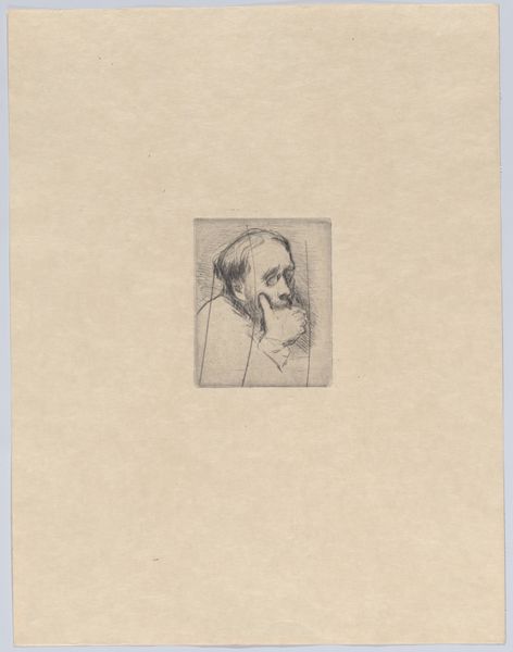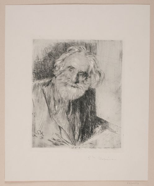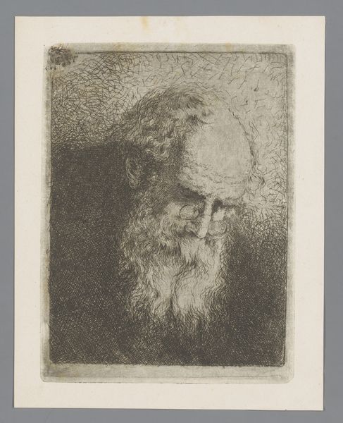 This is a print of an old man with a long beard, made by Willem Linnig the Younger sometime in the late 19th century. It is a great example of the etching process. The process involves covering a metal plate with a waxy, acid-resistant layer. The artist then scratches an image into that layer, exposing the metal underneath. The plate is then submerged in acid, which bites into the exposed metal, creating recessed lines. Ink is applied to the plate, filling these lines, and the surface is wiped clean. Finally, paper is pressed onto the plate, transferring the ink and creating the print. Here, the etched lines give the image a distinct texture, particularly visible in the man’s beard and hair. This technique allows for fine detail and subtle tonal variations, giving the portrait a sense of depth and character. The quality of line speaks to Linnig’s skill as a draughtsman. Looking at the image, we get a sense of the labor and skill involved in traditional printmaking. In this way, it prompts us to consider how materials, making, and context are essential for understanding the full meaning of the work.