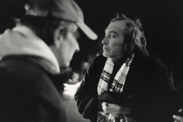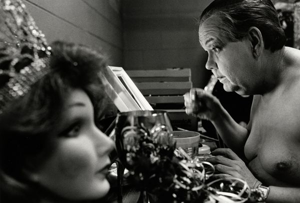 Editor: This is Gordon Parks' photograph of Giorgio De Chirico, taken sometime after 1949. It's a gelatin-silver print. It has a strong, almost stark, quality to it, focusing intensely on De Chirico's face amidst his art and a second, blurred figure. What strikes you when you look at this, especially regarding how it was made and the cultural context? Curator: For me, it’s about deconstructing the romanticized notion of the artist. Parks, through the photographic medium itself—the silver gelatin print, a mass-producible material—is engaging in a dialogue about accessibility and the de-mystification of artistic genius. Editor: De-mystification? How so? Curator: Well, look at the setting. De Chirico isn't presented in some isolated studio, divinely inspired. Instead, he is part of a scene. How does the placement of the female figure complicate a potential solitary reading of artistic expression, perhaps gesturing to labor and collaborative networks behind art production? Editor: I see what you mean! So, it’s less about singular inspiration and more about recognizing all the processes and materials, and the often unseen labor, that bring an artwork to life. The photograph as an artifact becomes central. Curator: Precisely. We are pushed to examine the economic and social conditions surrounding its production and distribution. It isn't just a portrait; it's a material object embedded in a complex system. Editor: That makes me consider the role of Parks as a photographer, how he is not only documenting, but actively shaping our understanding through this medium. Thank you. Curator: It's through understanding those very material conditions of art that we can have richer, more nuanced appreciation for both Parks’ photograph and De Chirico's legacy.