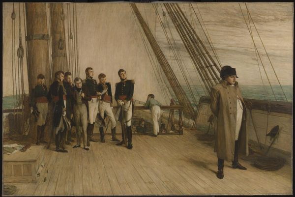 Editor: Here we have John Carlin's "After a Long Cruise" from 1857, an oil on canvas that’s bustling with figures along a waterfront. There's a vibrancy to the scene that's appealing, almost festive. What do you see when you look at this piece? Curator: Well, I'm immediately drawn to the details of the painting's materiality and how they speak to the social context. The oil paint, of course, was readily available, machine-made, allowing for such relatively precise renderings. But it's what is depicted that is truly telling: The availability of “Salt Provisions”, the tailored clothing, and even the oranges…these are markers of commodity exchange in this moment of maritime activity. Editor: So, you're saying that beyond the narrative of sailors on leave, the painting is also capturing something about the economics of the port at that time? Curator: Precisely. How are these imported commodities impacting both local vendors and newly arrived sailors eager to consume? What systems of labor supported the acquisition of these textiles, and what global trade made it possible for oranges to arrive here? Consider also how leisure and class intersect; notice those throwing fruit, how are their lives different from those of the sailors? It all speaks to production, availability, and distribution networks. Editor: I never would have looked at the painting that way. It gives a whole new appreciation for how interconnected everything was, even back then. Curator: Exactly! The artist wasn't just capturing a scene but a material moment, shaped by labor and access to goods. The value lies not just in the representation, but in what the painting reveals about how things were made and moved, who could afford them and who provided them, and what life for whom depended upon the processes required to yield access to provisions of the day. Editor: I’m definitely seeing more than just sailors enjoying shore leave now! Thank you. Curator: My pleasure! The art isn’t solely about what it appears to be; but what it brings to the surface of everyday life regarding power structures that operate both inside and outside the artwork.