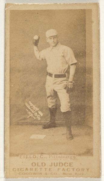 This is a baseball card of James G. Fogarty, Right Field for Philadelphia, from the Old Judge series made around 1887 by Goodwin & Company for Old Judge Cigarettes. The sepia tone flattens the image, lending it a timeless, almost sculptural quality. The composition is vertically oriented, focusing our attention on Fogarty who is framed against a blurred background. The simple design, with the player gazing upwards toward a floating baseball, plays with notions of anticipation and potential. The text is integrated into the lower portion, functioning as both label and advertisement, disrupting traditional hierarchies of art and commerce. In semiotic terms, the card operates on multiple levels. The image of Fogarty signifies athletic prowess and American ideals, while the cigarette brand promises sophistication and leisure. This juxtaposition creates a dialogue about value systems. As an artifact, this card represents an early form of commodity culture, where identity and aspiration are packaged and sold. It challenges us to consider how images mediate our understanding of self and society.