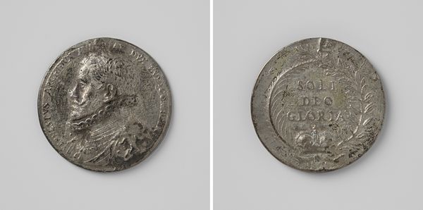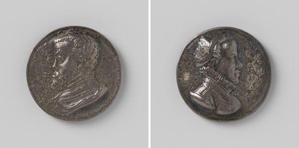 Editor: Here we have a metal relief, "Ter ere van Lodewijk II, koning van Hongarije en Bohemen, gevallen in de slag op Mohacs, en zijn vrouw Maria van Hongarije," created around 1526. It’s incredibly detailed for such a small-scale work. The mood feels… somber, given the context in the title. What catches your eye most about this piece? Curator: Ah, yes, it’s quite moving, isn’t it? Immediately, I see two contrasting scenes, almost like flipping through pages of history—a memorial coin, struck with both celebration and profound loss etched into its very surface. It speaks volumes about legacy and remembrance. Editor: Could you expand on that? Curator: Think about it: One side shows the royal couple, perhaps during happier times, almost idealized. And then, flip it over and bam!, the chaos of the Battle of Mohács—a pivotal, devastating defeat. Do you see how the anonymous artist captured both personal loss and a turning point in Hungarian history? It's a potent pairing. Editor: It’s like they’re saying, “Remember this glory, but also this tragedy." But how did the battle influence Renaissance art elsewhere? Curator: A question I often find myself pondering... well, this piece underscores the political upheaval happening during the Renaissance, yes, but also demonstrates how even seemingly small-scale artworks like this served to immortalize—or perhaps moralize—important figures and events. Did this shift your initial reaction to it at all? Editor: Definitely. Knowing the history deepens my appreciation. It’s not just a somber portrait, it’s a record—a carefully crafted message across time. Curator: Exactly. And that, my dear student, is often the most fascinating thing about art – peeling back the layers. Editor: I couldn’t agree more! Thanks for sharing your perspective.