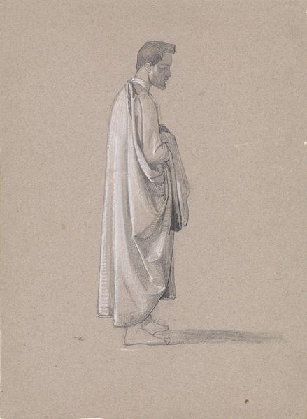 Editor: This is Isidore Pils's pencil drawing, "Saint Remi," created around the 19th century. It's a full-figure study of a person in flowing robes, with a blank, upturned face. It feels almost like a sketch for a larger history painting, but I’m intrigued by the incompleteness. What do you see in this piece? Curator: I see a poignant reflection of power and its representation. This "Saint Remi," though ostensibly a religious figure, exists within a visual language steeped in the colonial gaze. Consider the power dynamics inherent in academic art training: Whose bodies were deemed worthy of study? Whose stories were monumentalized through "history painting"? And who was excluded? This faceless figure, for me, raises questions about how religious and historical narratives were used, often problematically, to reinforce dominant ideologies. Editor: That's a perspective I hadn't considered. I was so focused on the technical skill and the classical composition. Are you suggesting that even in a drawing like this, there's an implicit commentary on social hierarchies? Curator: Absolutely. Art never exists in a vacuum. Even the choice to depict a "saint," to render him in this academic style, to focus on drapery and form – all these choices reflect and perpetuate certain values. Think about who commissioned and consumed art like this: predominantly the wealthy, white, male elite. We need to ask how these depictions shaped, and continue to shape, our understanding of history, religion, and identity. Is there something powerful about him not having a face? Editor: I suppose focusing on historical context gives it a new weight and it highlights the impact of the artwork in terms of religious views in European countries during the colonial period. I think I see this drawing differently now. Thanks for your time. Curator: The pleasure was all mine, I leave with many of the same considerations.
