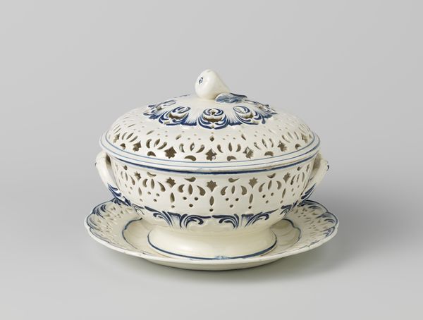 Editor: This is "Deksel met blad- en bloemslingers," or "Lid with garlands of leaves and flowers," made between 1774 and 1784 by Loosdrecht. It’s a ceramic piece and part of the decorative arts collection here at the Rijksmuseum. I notice how delicate the blue floral pattern appears against the bright white ceramic. What connections can we make with history when viewing this piece? Curator: This piece speaks volumes about class, consumption, and colonialism in the late 18th century. Can you see how the delicate, almost fragile, design contrasts with what was actually happening in society? Editor: I see how it almost seems divorced from reality, like a fantasy object. Curator: Precisely! Rococo, the style, was favored by the aristocracy and upper-middle classes. Think about the social context: these classes were thriving because of colonialism and enslaved people, and the beautiful ceramic works served to conceal those uncomfortable truths behind decorative arts. Where do you see those hints of aristocracy at play? Editor: The meticulous details, the time it must have taken to create this—that labor speaks to leisure, and someone with wealth commissioning it. Curator: Yes, and the very existence of this ceramic hints at the global trade networks, because the knowledge and techniques for creating this piece relied on accessing resources and technologies primarily available via exploiting labor across colonized lands. This isn't just a pretty lid; it's a material testament to power structures of the time. What do you take away from understanding this connection? Editor: It completely changes how I see it. What seemed like just a lovely object now feels like a loaded artifact of a very complex and unjust past. Curator: Exactly! Art can become an important resource of re-framing social discourse by contextualizing and re-evaluating material objects through new, critical lenses.