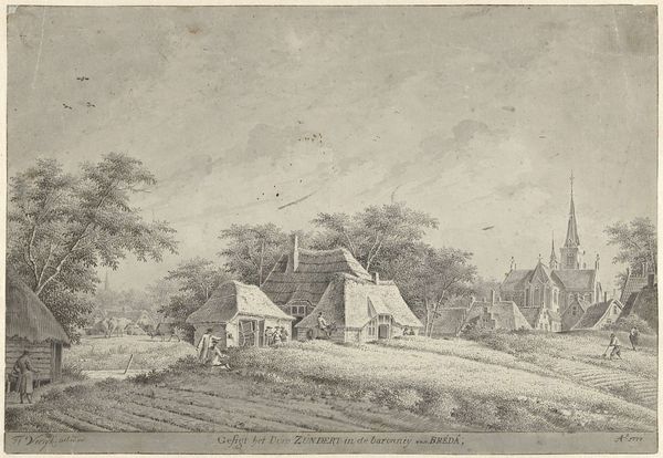 Curator: This delicate drawing captures a view of the church in Leerbroek. Created in the 18th century by Jan de Beijer, it employs ink on paper, showcasing the charm of the Dutch countryside. Editor: It's wonderfully understated, isn’t it? A real sense of peace. It reminds me of quiet Sunday mornings when I was a kid. The greyscale kind of washes everything in nostalgia. Curator: Absolutely. De Beijer’s work reflects the artistic interests of the Dutch Golden Age, particularly a fascination with topographical views and genre painting. This approach gained momentum amidst a surge in national identity formation. The Church becomes symbolic—the artist documents not just a landscape but a burgeoning cultural narrative. Editor: Makes me wonder about the people in the little boat. Were they just ordinary folks fishing, or do they stand for something bigger? Kinda wish I was there with them. Feels like time slows down in a place like that. Curator: The inclusion of figures does invite a closer reading. It humanizes the landscape, and raises several theoretical frameworks. We might see it through the lens of class. Who has the time for leisure, for quiet contemplation, who works on the land versus engages in leisure activity upon it? We may further infer elements of social identity in this scene. Editor: Huh. Never thought about fishing as a political statement! Mostly I just remember the time I got a hook stuck in my thumb... but I guess everything’s got a story behind it, huh? Curator: Indeed. These images played a vital role, reinforcing regional identity. They were documenting a specific moment in the culture, while they looked to a burgeoning national cultural identity. Editor: I dig it. This drawing is deceptively simple, like a half-remembered song that hits you right in the feels. All in all, you just want to breathe that quiet country air, ya know? Curator: And to view it in our contemporary world, from a standpoint of political or historical reflection allows us greater perspective, too. Editor: Definitely something special. Makes you think and feel, all at the same time.