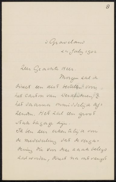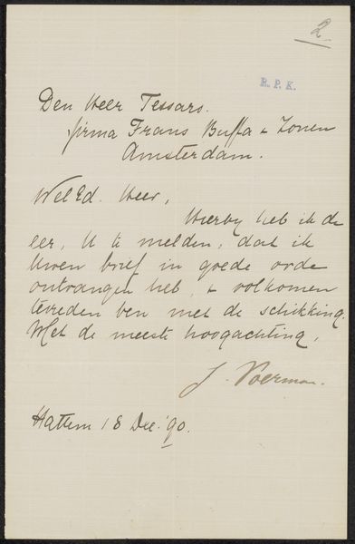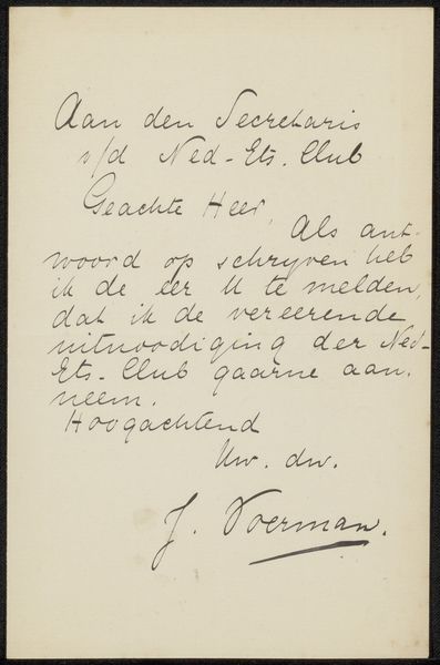 Editor: So, this is Jan Voerman's "Brief aan Philip Zilcken," possibly from 1888, a drawing in ink on paper. My first impression is just how intimate it feels, seeing the artist’s handwriting like this. What do you see in this piece? Curator: The handwriting is indeed key. It's not just a method of communication but a carrier of Voerman's persona. Note the flourishes, the deliberate curves, the weight given to certain words. The script itself becomes an image, resonating with late 19th-century sensibilities of individual expression. How do these visual cues speak to you? Editor: I suppose it gives the message more weight, or perhaps authenticity? Like it's not just the information, but Voerman himself giving his word. Does the act of hand-lettering elevate its significance? Curator: Precisely. Consider the historical context. This letter predates widespread typewriters and certainly digital fonts. Handwriting held a stronger connection to the author's identity, lending it a performative weight, an unspoken pact of trust. Is it a sincere expression or just the aesthetic conventions of the time? Editor: Maybe a bit of both? It's interesting to think about how the meaning would change if it were typed instead. It loses that personal touch, the mark of the artist. Curator: The symbol of the hand. Also, let’s consider the act of writing. The drawing is a form of inscription, creating cultural memory but also forging personal memory through association. The choice to commit these words in this unique style also reflects a specific time and space – fin-de-siècle Amsterdam, the art world. The content relates to his support of a fellow artist; what could we discern of the cultural environment reflected? Editor: So it's a little time capsule then. The writing style and even the paper itself tells a story about Voerman's time. It adds so much depth to what could have just been a simple message. Curator: Indeed, what appeared initially as an innocent personal communique unfolds into a powerful testament of history and individual symbolism. The way imagery permeates through time can certainly offer insight into even the most personal objects.