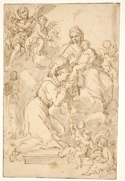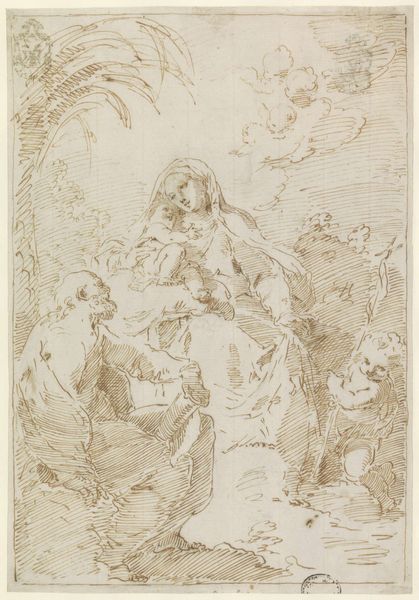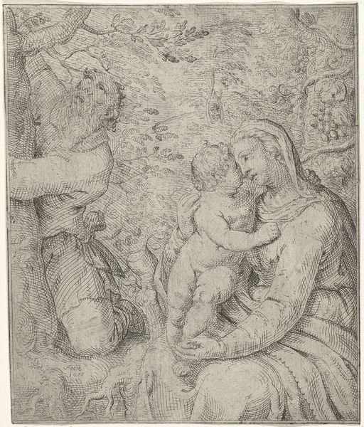 Giuseppe Diamantini etched this plate depicting the Holy Family with Saint Elizabeth. The figures are arranged to convey familial love, emphasized by the presence of the Christ child and a young John the Baptist. Note John's embrace of the lamb. This motif—the lamb as a symbol of innocence and sacrifice—reverberates through centuries. We see it echoed in early Christian art, where Christ himself is portrayed as the sacrificial lamb, a symbol of his ultimate sacrifice for humanity. It is a visual echo of the Agnus Dei. Consider how the tenderness of the figures stirs deep emotional responses. Such images tap into collective memories and shared human experiences of love, protection, and sacrifice. The lamb, held by a child, becomes a poignant emblem of vulnerability, evoking powerful emotions across time and cultures.