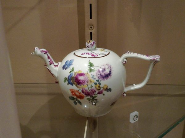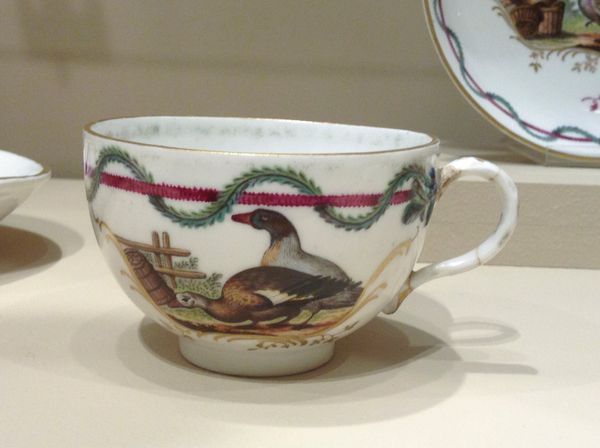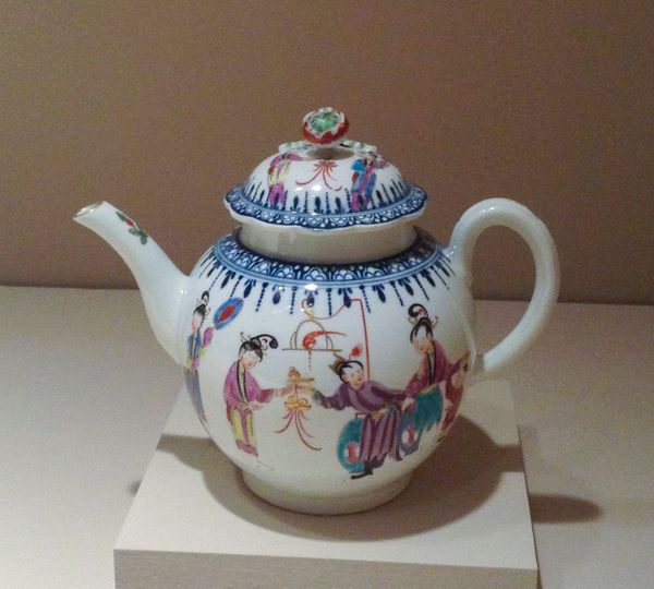 Editor: We’re looking at a porcelain Teapot from between 1725 and 1745. It’s currently held at the Metropolitan Museum of Art. There are delicate landscape paintings with a deer and a bird depicted on its surface. The overall design seems so extravagant, I can only imagine someone from the high society enjoying a cup of tea with it! What strikes you most about this object? Curator: Isn’t it just darling? What fascinates me is how it whisks you away. Imagine the artisan, head bent low, breathing life into this tiny world! They are literally bottling a serene vista. Notice how the curves echo nature; the handle mimicking a blossoming branch perhaps? Do you suppose, when it was made, this offered a mini-retreat from formal court life? Editor: I hadn’t thought of it that way, but it makes total sense. It's like having a personal window to nature within reach. Almost…portable! Curator: Exactly! And tea, remember, wasn't just a drink. It was a ritual, a social act. Owning such a precious item would have announced one’s sophistication and status. This little vessel contained far more than tea. What feelings come to mind as you imagine yourself with it? Editor: I can imagine the scene... it gives me a warm and inviting sensation. Curator: Ah! So the artisan did their work, didn't they? To stir our souls, to create intimacy, using only paint and clay! That teapot did what good art always does: transport us. Editor: I guess art objects always carry layered meaning than we think. Thanks, that’s quite fascinating to consider.