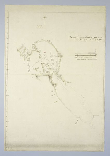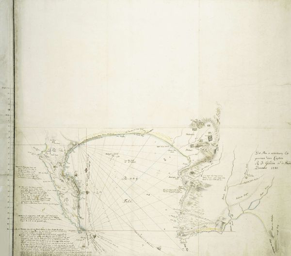 Curator: It's extraordinary to observe how Robert Jacob Gordon, circa 1784, captured Saldanha Bay in this map rendered in pencil and watercolor on paper. It speaks volumes about the intersection of art and exploration in that era. Editor: Yes, its subdued palette and delicate lines really convey a sense of calm precision, don't you think? The textures are almost tangible. Curator: Precisely! But beyond the aesthetics, this map holds profound historical significance. Gordon, a military commander in the Dutch East India Company, charted this bay at a pivotal moment in colonial history. His maps were not merely geographical tools, but instruments of power. Editor: I see what you mean. However, I’m immediately drawn to the careful layering of pencil to indicate depth and form, and how effectively a few faint washes delineate land and water. The map is functional, but its composition possesses an artistic elegance, even if it’s mostly utilitarian in purpose. Curator: Absolutely. And that duality is precisely what fascinates me. The visual language of cartography was strategically deployed to establish claims to territory and facilitate trade routes. Editor: Do you see the radial lines? They strike me as bold assertions of navigational accuracy, cutting through what must have been a perceived untamed space. They draw my eyes to the map's conceptual centre and hold the surrounding details within the map’s framework. Curator: True, and consider the use of vernacular language in labeling specific geographic points. Those names and markers became instruments for solidifying colonial control over space and history. Editor: Indeed, these lines, tones, and even that handwriting reveal more than just locations—they offer insight into the prevailing mindset about capturing territory. Curator: It also makes me think of the relationship between Europe and the colonies, the tension between documenting the world from a far removed point of view, as well as understanding the realities on the ground. Editor: In that regard, these faint lines and pale hues also feel less imposing. Perhaps their subtlety allowed viewers back then to better reconcile and normalize what would become significant changes in the cultural landscape. Curator: This drawing prompts us to reflect on our responsibility to understand the legacies of colonialism and the role that cartography, art, and culture play in constructing narratives of power and domination. Editor: And as we continue looking at it, may we consider these aesthetic choices and understand them in relation to the human need to map and tame our environment.