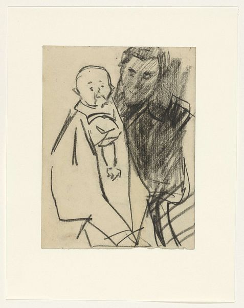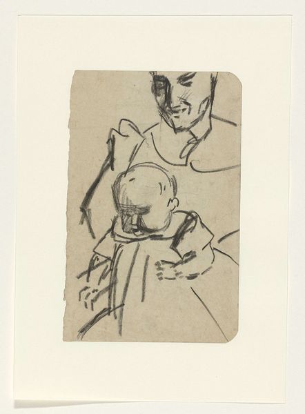 Curator: Immediately, I'm drawn to the raw, intimate quality of this drawing. The loose lines convey a tenderness, despite being somewhat unfinished. Editor: Here we have Isaac Israels' "Moeder met kind", or "Mother with Child," created sometime between 1875 and 1934. The artwork in the Rijksmuseum is rendered with pencil. It is such a tender portrayal of a mother and child! Curator: Precisely. The varying pressure in Israels’s pencil strokes indicates areas of shadow and light. Observe the heavy shading which forms the figure of the mother in the background and around her silhouette as she cradles the infant; then notice the comparatively fine rendering used to depict the child's face, focusing the eye and creating a captivating juxtaposition. Editor: What I find striking is the way Israels uses the theme of intimism, which we so commonly associate with late 19th and early 20th century artists who are attempting to give glimpses of scenes of everyday, bourgeois interior life, particularly the world of women. These everyday scenes became associated with quiet moments of domesticity. These images became important within art exhibition spaces to connect the female figure to certain notions of purity, femininity and virtue. Curator: A persuasive reading! To elaborate on a formalist perspective, the gestural lines effectively establish the intimate relationship through the close placement and protective hold. Note, though, how Israels chooses not to detail either subject explicitly. Editor: That's insightful. These pieces prompt viewers to reconsider assumptions around motherhood as presented through artworks, pushing conversations about maternal and gender dynamics to center stage. These pieces really became useful within the domestic spaces they were produced in. Curator: Exactly, the composition reinforces this notion—a subtle choreography that encapsulates themes of connection. It will be hard to forget this piece of artwork. Editor: I concur; seeing it within the larger frame of cultural representations reveals how gender is produced and received. Thank you!