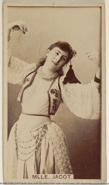 Curator: This collotype print comes to us from sometime between 1886 and 1890, made by Goodwin & Company as one of the Actors and Actresses series (N171) for Gypsy Queen Cigarettes. Editor: There's a striking vulnerability to this portrait, almost an innocence, despite the commercial context. The soft sepia tones add a layer of antique charm and her guarded gaze creates a feeling of intimate exposure. Curator: This was, in fact, a piece of calculated marketing strategy. The burgeoning mass culture commodified beauty and fame; figures such as Ida Mulle became desirable objects linked inextricably to the consumption of cigarettes. What does it mean to assign value and trade women like trading cards? Editor: Regardless of its context, technically speaking the composition uses very precise, symmetrical framing, focusing attention directly on her face. Her crossed arms draw attention to the delicacy of her hands and small ring. The lighting is undeniably romantic, casting the details in the image in sharp contrast to a muted backdrop, really focusing on the texture. Curator: Absolutely, and let’s remember what such careful compositional detail and idealization signifies during that time period. The emphasis on white, feminine beauty reinforced a racial and gendered hierarchy central to the era’s political power structure, not merely "a pretty picture". It implicitly posits a white woman as the archetypal figure of aspirational value. Editor: Yes, that can be reasonably said. But the execution of that intent isn't necessarily as reductive as its intent. We have sharp lines alongside blurry soft shading; what does that mean aesthetically? The interplay creates a strangely nuanced and captivating visual experience that adds richness to the portrait, creating movement despite the photograph's stillness. Curator: It is fascinating to examine these small objects which belie larger political and cultural anxieties surrounding gender, performance, and burgeoning capitalism in America. Editor: Ultimately, by paying attention to small details like her subtle smile or ring on her finger, the texture of the paper used for the print, it becomes clear that the portrait transcends its historical and cultural moment, presenting the viewer an ethereal beauty to consider beyond our social analysis.