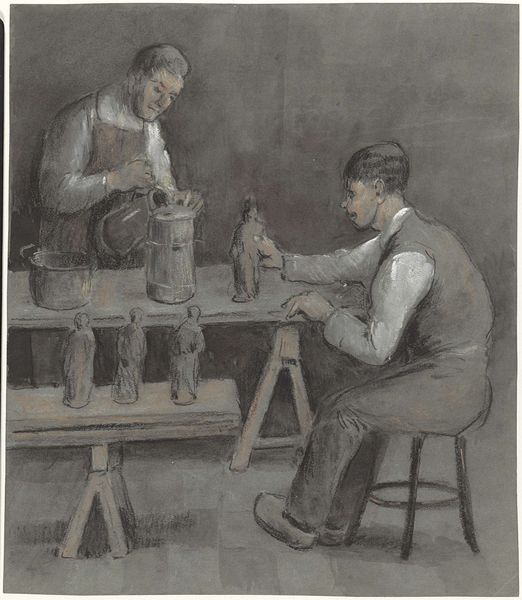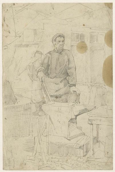 Curator: The first thing that strikes me about this pencil drawing is how grounded and intimate it feels. Editor: Indeed. We are looking at "Pottenbakker aan zijn draaischijf," or "Potter at his Wheel," created by Herman Heijenbrock sometime between 1881 and 1948. I think Heijenbrock really captured a feeling here—a reverence for manual labor and the creation of everyday objects. Curator: The roughness of the medium—the pencil itself—amplifies that feeling for me. You see the immediate marks, the pressure, the hand of the artist so directly linked to the hand of the potter. And both are, of course, directly involved with the shaping of raw materials into a finished product for everyday use. It's pure materiality in action! Editor: I agree, the rawness is palpable. And viewing it now, it serves as a poignant reminder of the often-unseen labor that goes into producing the objects we take for granted. The social history surrounding this piece feels crucial; Heijenbrock positions this potter with a certain dignity. Are we meant to reflect on the shift away from handcrafted items towards mass production, perhaps? Curator: Precisely! I think Heijenbrock wants us to consider the human element embedded within objects. Look at the craftsman's concentration, the simple tools; this drawing functions as an artifact in itself, recording a specific kind of work and its place in society. He's documenting both the skill and the physical labor, in a way conferring a kind of nobility to the act of creation. Editor: Absolutely, and consider how museums shape this narrative. By exhibiting a drawing like this, aren’t we implicitly elevating it? Transforming a depiction of manual labor into a valued object for consumption within a gallery space? There's a compelling paradox at play, showcasing labor within the elite walls of art institutions. Curator: Yes, the act of display changes everything. We highlight not just the skill, but the social context and the implications of transforming raw material into crafted good, reminding people of the origin and processes in production. It invites us to question the values we assign to different kinds of work and different kinds of objects. Editor: It makes me think differently about the objects I surround myself with—where they come from, and what kind of labor was involved in making them. A powerful and necessary reminder. Curator: Agreed, I'll certainly appreciate my next handmade mug with a new perspective.