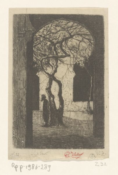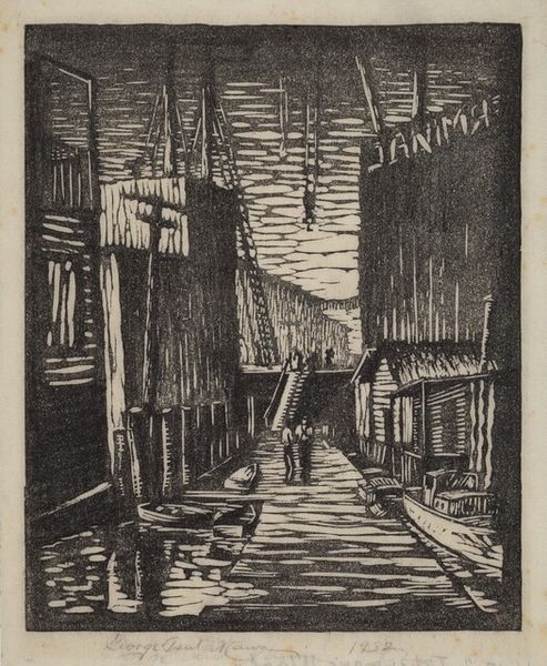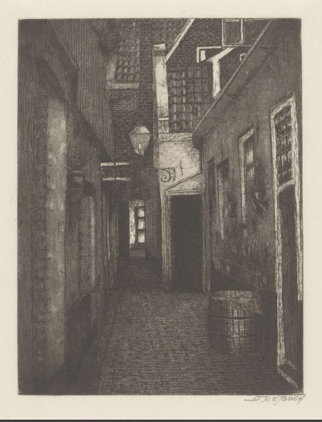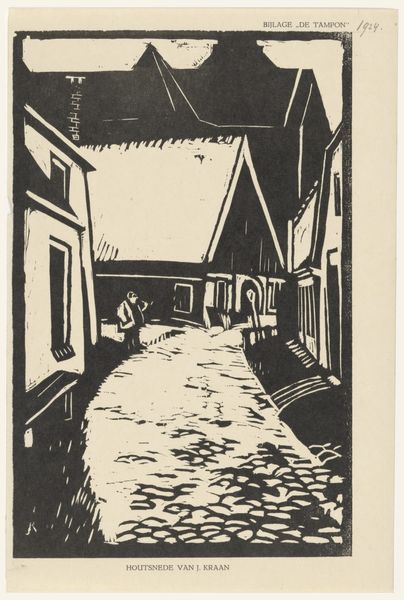 Curator: Let's discuss S. de Jongh’s “Steeg met poort,” created in 1924. This striking woodcut, reminiscent of old Dutch cityscapes, captures an intimate alleyway view. What are your first impressions? Editor: It’s evocative. I’m immediately drawn to the stark contrasts, the dramatic light and shadow. There’s an undeniable sense of claustrophobia but also curiosity. I want to walk down that alleyway and see what's at the end. Curator: The woodcut technique itself emphasizes those feelings. The deliberate cuts carve out harsh angles that amplify the sense of enclosure. De Jongh lived and worked during a period of rapid urbanization. Do you think this imagery comments on the increasing density and the human experience within urban spaces? Editor: Absolutely. Beyond mere documentation, the print delves into the experience of navigating a shifting landscape. The shadow and the height of the surrounding brick hint at being enclosed; an environment where one's movement could be surveilled or even oppressed. Consider the politics of space, who owns it, who is allowed access, and what societal dynamics are at play. Curator: Fascinating point. Woodcuts and prints had become politically charged in the early twentieth century. Could De Jongh be channeling some of that spirit here? Consider that printmaking offered avenues for dissent. This image is so textural. Editor: Yes, it feels charged, especially when viewed through the lens of power dynamics and socio-political factors affecting city life in the early 20th century. It's less a romantic cityscape and more a statement about urban confinement, I believe. It raises complex questions about urban existence and its implications for our mental and societal well-being. Curator: An incisive interpretation. "Steeg met poort" offers us, beyond its aesthetic merit, an early record of these changing perceptions that have marked the past 100 years of modern society. Editor: This analysis certainly enriches my view of De Jongh's woodcut, deepening its emotional weight, its link to power structures. It encourages viewers to look at art as a product of its context and a dialogue on sociopolitical concerns.