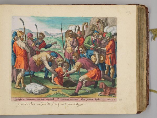Curator: This is Johann Sadeler the First's "The Taskmasters of the Pharaoh Beating the Israelites," housed here at Harvard Art Museums. Editor: Oof, a bit heavy, isn’t it? All that frenetic energy and those strained faces... it really captures the harshness of the scene. Curator: Indeed. Note the artist's emphasis on line. The figures are carefully delineated, and the composition is quite structured, wouldn't you agree? Editor: Absolutely, but what stands out to me is how Sadeler manages to infuse a biblical narrative with such palpable human emotion and—dare I say—a touch of theatrical flair. Curator: Yes, that theatricality serves to amplify the moral lesson, wouldn't you say? And the interplay between the foreground action and the distant setting—a landscape tinged with smoke—adds depth. Editor: It’s a powerful piece—a stark reminder of oppression, but also of resilience, wouldn't you agree? A story visualized with raw intensity and incredible detail.
