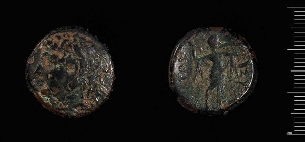 Editor: Here we have a coin of Philip V of Macedonia. It’s small and worn, giving it a sense of history and tactility. What do you see in this piece? Curator: The imagery on coins like this speaks volumes about power, identity, and cultural aspirations. The ruler's portrait, often idealized, projects authority. Are there any visible symbols or figures? Editor: There seems to be a lion on the front. Curator: The lion embodies strength and kingship. Its presence may evoke a connection to a specific deity or ancestral figure, further legitimizing Philip's rule. How does the coin’s weathered state affect your perception? Editor: It makes it feel more real, like holding history itself. Curator: Indeed. The wear and tear can symbolize resilience. It's a potent reminder of the enduring power of symbols to transcend time. Editor: It’s fascinating how such a small object can convey so much meaning! Curator: Exactly! These images are powerful cultural symbols with staying power.