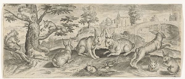 Jan Griffier created this print, "Three Hares in a Landscape," sometime between 1665 and 1718. Griffier was part of a wave of Dutch artists who, in response to the turmoil of war, turned away from human subjects and towards the natural world. This etching feels like a fable, each creature caught in its own drama, yet connected by the same landscape. We see a bird, perched precariously on a tree branch, and hares, some frozen, others fleeing. It's an emotional landscape, mirroring a society in flux. Griffier's work departs from traditional landscape paintings that often served as backdrops for aristocratic portraits. Instead, he focuses on the everyday existence of animals. The animals are rendered with a stark realism and perhaps serves as a metaphor for the human condition.