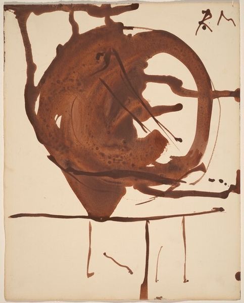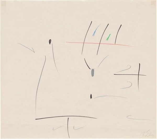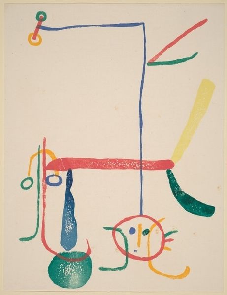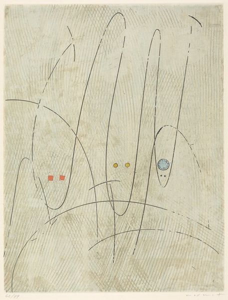 Curator: Looking at this mixed-media print from 1949, you might find yourself contemplating the world through Konrad Cramer's eyes, especially his work called "Untitled (Guitar)". Editor: Immediately, I'm struck by how minimal it feels. The muted tones and sparse lines create a surprisingly dynamic sense of incompleteness. It's suggestive more than descriptive. Curator: Interesting. While appearing simple, this piece is full of symbolism if you think of the history and evolution of the guitar; it holds cultural significance beyond being a musical instrument, a signifier of expression, longing, even revolution in certain contexts. The fragmented guitar, then, can be seen as a broken ideal. Editor: I see what you mean. Focusing on the formal qualities, notice how the lines define space but never quite enclose it. It’s almost like a deconstructed Cubist painting. The colors, especially that muted blue, give depth to otherwise flat planes. Curator: I wonder, also, if Cramer's intentional use of incompleteness points to a yearning, or the memory of what once was – that instrument might echo pre-war hopes of creative freedom against a world on the brink. Perhaps the incomplete shape is a lament. Editor: Perhaps. But isn’t the beauty here the ambiguity? We read the artwork according to our own historical baggage, and frankly, for me, the texture adds a dimension I’m not prepared to abandon for an interpretation driven solely by cultural symbolism. Curator: Absolutely! Visual and material cues interact with symbolism, enriching and deepening layers of interpretation. It’s this tension, and resolution, which connects us through cultural memory to art! Editor: Indeed! It reminds me to observe how composition informs both subject and the emotions these bring up, which I think is what Cramer wanted.