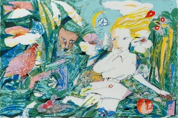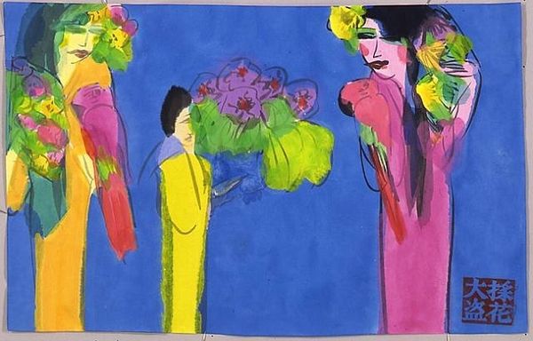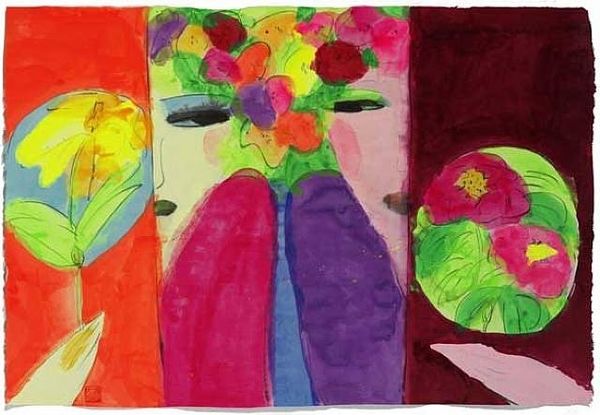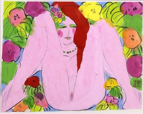 Walasse Ting created "Still Waiting For You" using vibrant watercolors. Notice how the light washes of pink and blue create a dreamlike, sensual atmosphere, while bold reds and greens add dynamic contrast. The composition features a reclining figure, intertwined with lush floral motifs. Ting challenges traditional form and perspective, flattening the picture plane and blending figure and ground. The painting is structured so that the interplay between abstraction and figuration destabilizes fixed meanings. The bright colors and simplified forms evoke a sense of playful eroticism, but also a melancholic reflection on desire and anticipation. This creates a visual language of both immediacy and depth. The interplay between figuration and abstraction in this artwork, invites us to reconsider the boundaries between representation and expression. It is not merely a visual experience but also a profound meditation on the complexities of human emotion.