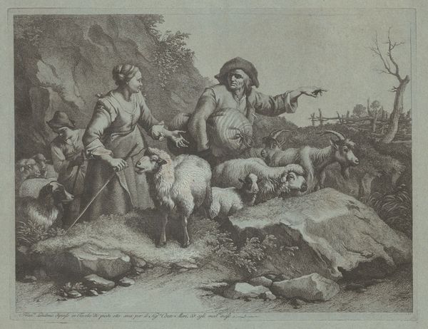 This etching by Francesco Londonio presents a pastoral scene, likely from the late 18th century, featuring shepherds amidst their flock and cattle. The animals, especially the cow, are symbols deeply rooted in cultural memory, representing fertility, nourishment, and the bounty of nature. We see the motif of the shepherd, a figure that transcends time, harking back to biblical and classical antiquity. The shepherd is not merely a herdsman; he is a symbol of care, guidance, and protection. He is the Good Shepherd, an archetype that appears across religions and cultures. Think of the Christian parable, or even the ancient myths of pastoral gods watching over humanity. Here, these humble animals and watchful figures engage us on a primal level, tapping into our collective subconscious. The scene evokes a sense of nostalgia, a yearning for a simpler, more harmonious existence. This yearning, this emotional pull, is a powerful force that has driven artists and audiences alike to return to these bucolic images time and again.
