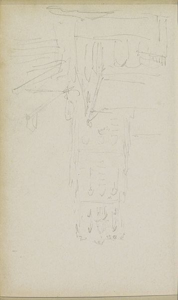 Curator: Adrianus Eversen's "Gezicht op Harlingen met het stadhuis," or "View of Harlingen with the Town Hall," is a pencil drawing, probably from somewhere between 1828 and 1897. Editor: It's quite delicate. A ghostly impression, like a memory of a town square rather than a detailed record. There's an almost dreamlike quality about the way the lines fade in and out. Curator: Eversen's architectural paintings and drawings often functioned as documents of the urban landscape, charting the growth and transformation of Dutch cities. They were part of a larger impulse in 19th-century Europe to inventory and classify national heritage. Editor: And here we see the town hall almost dominating the scene, drawn from an unusual angle that lends it a symbolic weight. Civic buildings, particularly town halls, often represent order and collective identity. The artist draws our eye to it. Curator: The placement and perspective serve a purpose, placing it, quite literally, above all else. Perhaps signaling its role as the ultimate arbiter of civic life. I do think it is fascinating the artist leaves his under-drawing on view—exposing his working. Editor: Absolutely. And, think about it—the pencil marks themselves are interesting artifacts. Each line tells of Eversen’s intentions but equally interesting the hesitations, creating an almost sacred diagram. Curator: While not considered one of the preeminent draftsmen, Eversen still shows a skill for documenting social progress in that part of Europe, and perhaps the rising urban pride through the building as image. Editor: I appreciate this intimate glimpse, the visual code behind something we perceive as civic power and pride, captured in a sketch. It's a humble gesture. Curator: Agreed, it allows us to reflect on the past and our own connection to symbols of place and history, and on that visual, symbolic conversation over time.
