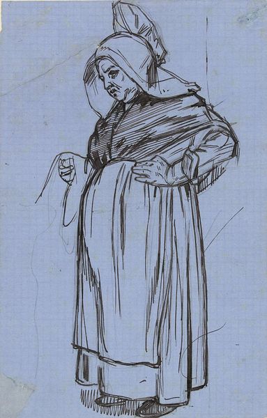 Editor: Here we have Ferdinand Hodler's 1908 pencil drawing, "Farewell participating female figure." I'm immediately struck by the raw emotion; you can almost feel her sadness despite the simplicity of the lines. What captures your attention when you look at this piece? Curator: The raw emotion is it exactly. But I also think about impermanence. You know, Hodler uses these simple lines, like breaths almost, to capture a feeling that just won’t stick around. Do you get the sense that this isn’t just a drawing, but a ghost of a feeling? Maybe even *his* ghost of a feeling? Like he saw it, felt it, drew it and it’s gone. The line quality seems so fragile, as if the figure could disappear with a breath. Editor: A ghost of a feeling, I like that! It’s so fleeting, but very poignant! Almost like the memory of grief. So it sounds like the simple lines amplify, rather than diminish, the artwork's emotional effect. Do you think there's a reason he chose to capture it this way? Curator: Hodler was knee-deep in Symbolism, remember? And they were all about expressing interior states. Maybe a quick, raw sketch allowed him to get closer to the core feeling, bypassing all the fancy techniques that could dilute the emotional punch. Tell me, what does the gesture say to you? Her face hidden? Editor: Well, I read that gesture as someone overcome with grief. Perhaps trying to hide it, but not succeeding. Curator: Right! Perhaps that moment after someone says farewell for the last time, and tries to compose oneself. To think he did it with some fleeting pencil marks makes my mind swoon. That is what is genius, and a talent I have only dream of, alas... Editor: It's funny; it's just a pencil sketch, but feels monumental in feeling! Curator: Absolutely. A whispered goodbye echoing through time.