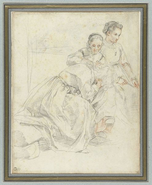 Editor: This is Mattia Preti's drawing, "Adoration of the Shepherds," rendered in chalk, ink and paper. I find the tonal range lends it such a reverent, gentle atmosphere. How would you approach interpreting such an intimate scene? Curator: Intimate, yes, that's beautifully put. For me, it's like peering into a dream, a faded echo of something sacred. The Baroque period loved these dramatic contrasts, yet here, Preti uses soft lines, as if muting the fanfare to reveal a tender moment. Look at the shepherds' faces, etched with awe – not grand pronouncements, but quiet wonder. Tell me, what strikes you most about their expressions? Editor: Their humbleness, maybe? They're so moved, caught up in this holy instant. The rough lines even suggest their… lack of polish, if you will? Curator: Exactly! It's less about idealised perfection, more about real, weathered humanity encountering divinity. You can almost smell the hay, hear their breathing, can't you? Do you get the feeling that this drawing wants you to contemplate faith at the level of our most visceral sensations? Editor: I hadn’t considered that, actually! Now I can't help but notice it. And here I was focusing on formal analysis... Curator: Formal analysis is the launchpad, love. But trust your gut, your own human response. Art speaks to us in whispers, if we're willing to listen. Editor: So, it’s like trusting your first impression and letting that guide your exploration of the artwork? Curator: Precisely. Trust your eyes and your heart and maybe let this old drawing tell you something about hope or devotion, something simple but real. Editor: I see. Well, now, I am considering the Baroque from a totally new perspective. Thank you!