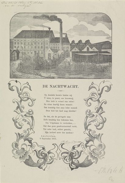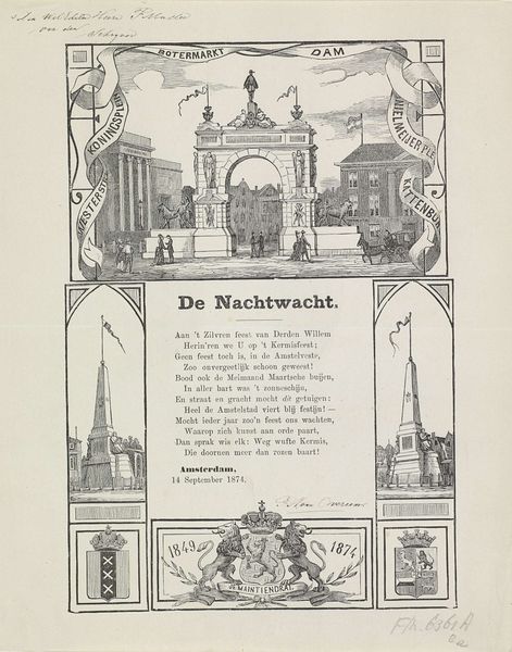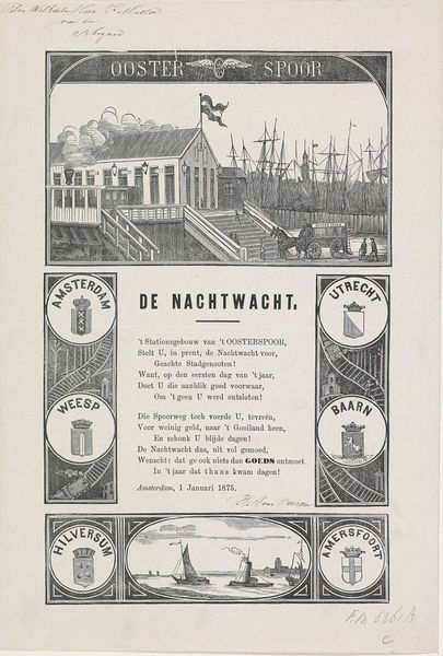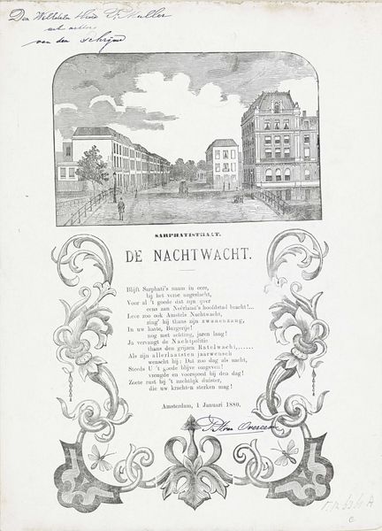 This New Year's greeting from the Amsterdam night watch for 1872, is a testament to the power of printmaking as a mode of communication. Likely a wood engraving, the image would have been made by carving into a block of wood, then inking the surface to produce multiple impressions. The choice of this medium is significant. As an easily reproducible format, printmaking facilitated the widespread distribution of information and imagery. The detailed street scene, the ornate decorative elements, and even the text itself, would have all been meticulously carved, requiring great skill from the printmaker. This form of production reflects the rise of mass media and a growing reading public, connecting everyday life and the industrial revolution with the intricate craft of printmaking. By examining the materials, making, and context, we understand how deeply art and social life are entwined.