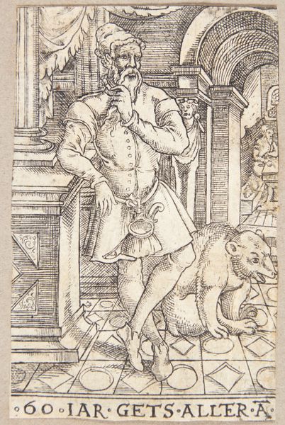 This is a small engraving titled "50-års alderen (Stillestan)" made by Balthasar Jenichen, around the late 16th century. Jenichen worked during a period of significant religious and political upheaval in Europe, so naturally his art engages with questions of identity and moral judgment. The print depicts a man of noble bearing accompanied by a dog. The backdrop is populated with various scenes of industry and commerce. The words "50 iar stillestan" translates to "50 years standstill", indicating that this is an allegory of middle age. The engraving provides us with a glimpse into early modern society’s values and anxieties, particularly around the concept of aging and status. The presence of the dog, traditionally a symbol of loyalty, may suggest the virtues to which one should aspire even as one advances in years. But consider also the emotional dimension of this work. Doesn't it speak to the deeply personal and universal experience of confronting one's own mortality? The small size of the engraving invites us into an intimate encounter with these profound themes.