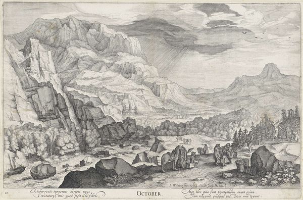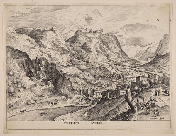 Curator: I find myself drawn into the immersive landscape depicted in "The Crafty Bird-Catcher (Insidiosus auceps)" a print dating from around 1550-1560 and attributed to Johannes van Doetecum I after a design by Pieter Bruegel the Elder. Editor: The intricacy is astonishing. The way the mountainous landscape dwarfs the tiny figures creates an immediate sense of humanity's smallness against nature's grandeur. And I immediately note the various printing techniques such as engraving, and etching that help give different tones in the print. Curator: Indeed, the title hints at a deeper social commentary, doesn't it? "Insidiosus auceps" can be interpreted as insidious deception. Consider the crafty bird-catcher as a symbol, perhaps representing those in positions of power who prey on the vulnerable. Bruegel often embedded moral lessons within his landscapes, using the scenery as a stage for human folly. Editor: And consider the paper it is printed on; during this time, paper itself would have been a commodity. Where was the mill, what were the working conditions, what kind of labor went into its production and how would the material reality shape our interpretation? Curator: Precisely! Think about the intersectional impact of religious persecution and the socio-economic disparities during the Northern Renaissance, a tumultuous period in Europe’s narrative that is so closely bound to the land. We must ask: Who could afford art and the leisure time to engage in the kind of pursuits Bruegel pictures? How is access stratified? Editor: By emphasizing this production we might better see the relationship to art production more generally—perhaps more attention could then be given to artisanal traditions rather than the individual artist genius. The social and historical moment offers itself in this singular item as a material form, so it helps the contemporary viewer connect to it. Curator: This artwork, through its title, composition, and likely, Bruegel's intention, holds a mirror to timeless questions of morality and power—questioning if we've advanced. It reminds us that the landscape of human interaction, like the natural world, can conceal hidden dangers and inequities. Editor: Focusing on its material conditions contextualizes "Crafty Bird-Catcher" inside of its time and allows it to endure materially into the future, revealing to contemporary viewers just how our perceptions can change by considering art as a cultural product that intersects at the crossroads of its specific moment and cultural impact.